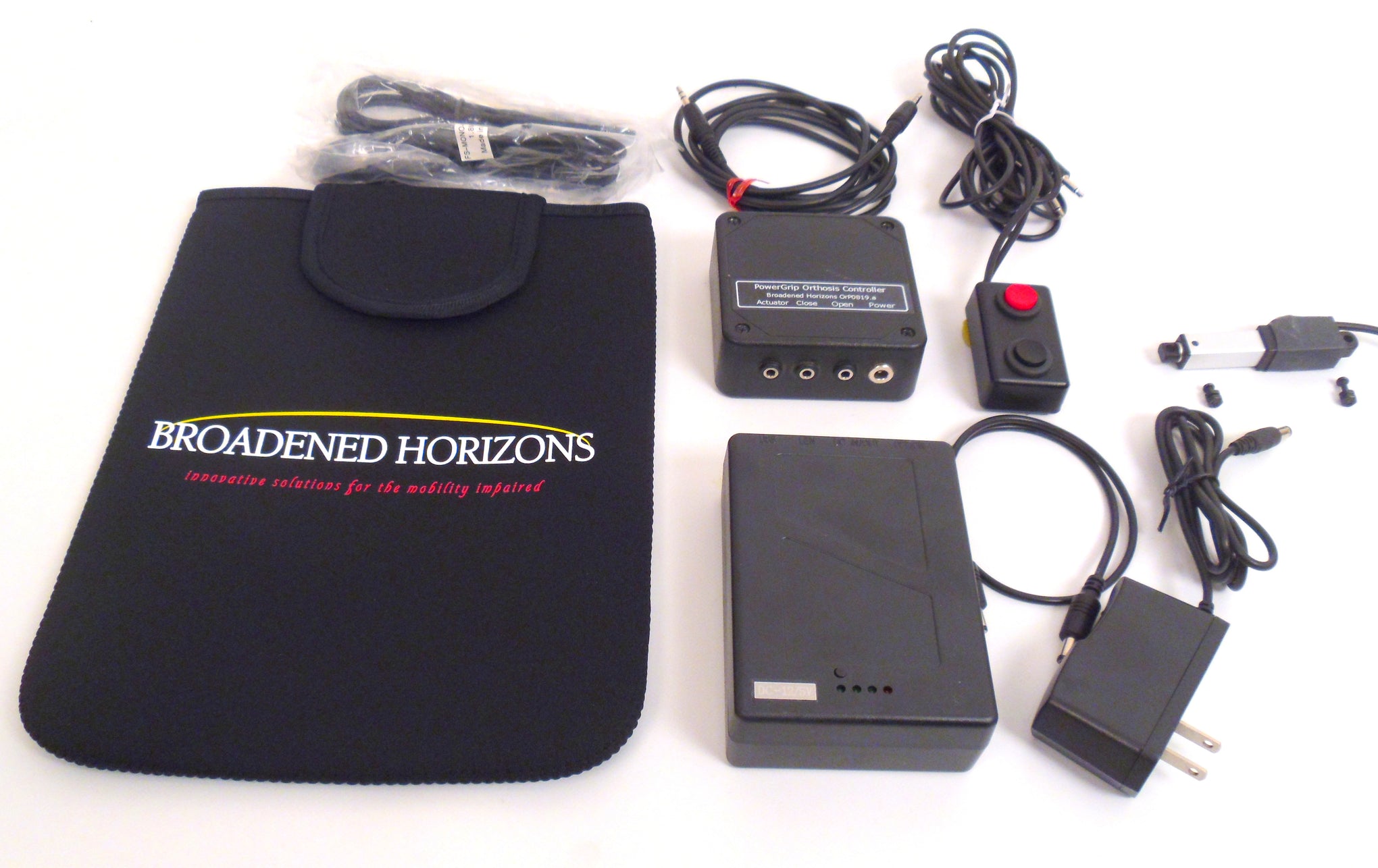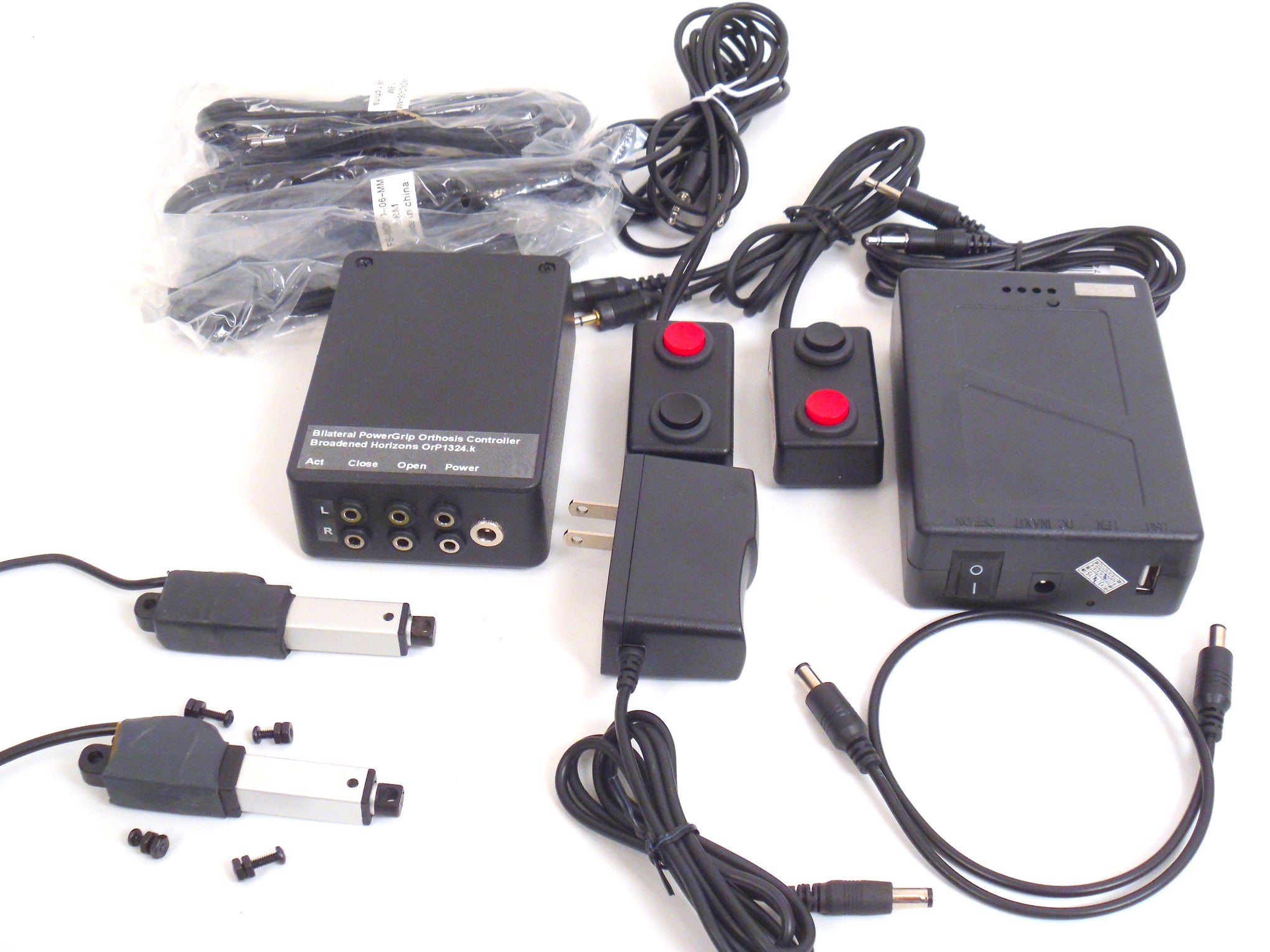 Turns a new or existing tenodesis or rachet-style orthosis into a PowerGrip Assisted Grasp Orthosis. The Bilateral Kit controls both left and right orthoses. - 2 Actuators, Bilateral Controller, Battery, & 2 Switches