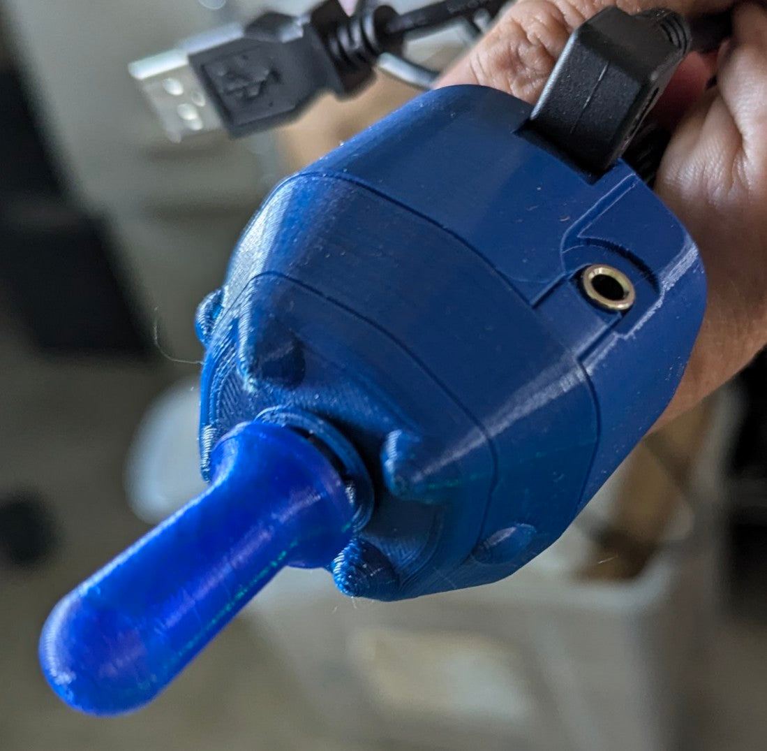 - Slightly rubbery push-on joystick knobs are 3D-printed and can be completely customized by anyone with access to a 3D printer or special order. We are considering a few variations, such as concave for a fingertip or tongue, here and with a small hole for built-in very pliable 1/16 inch silicone Sip-n-Puff tube. Please give us your feedback?