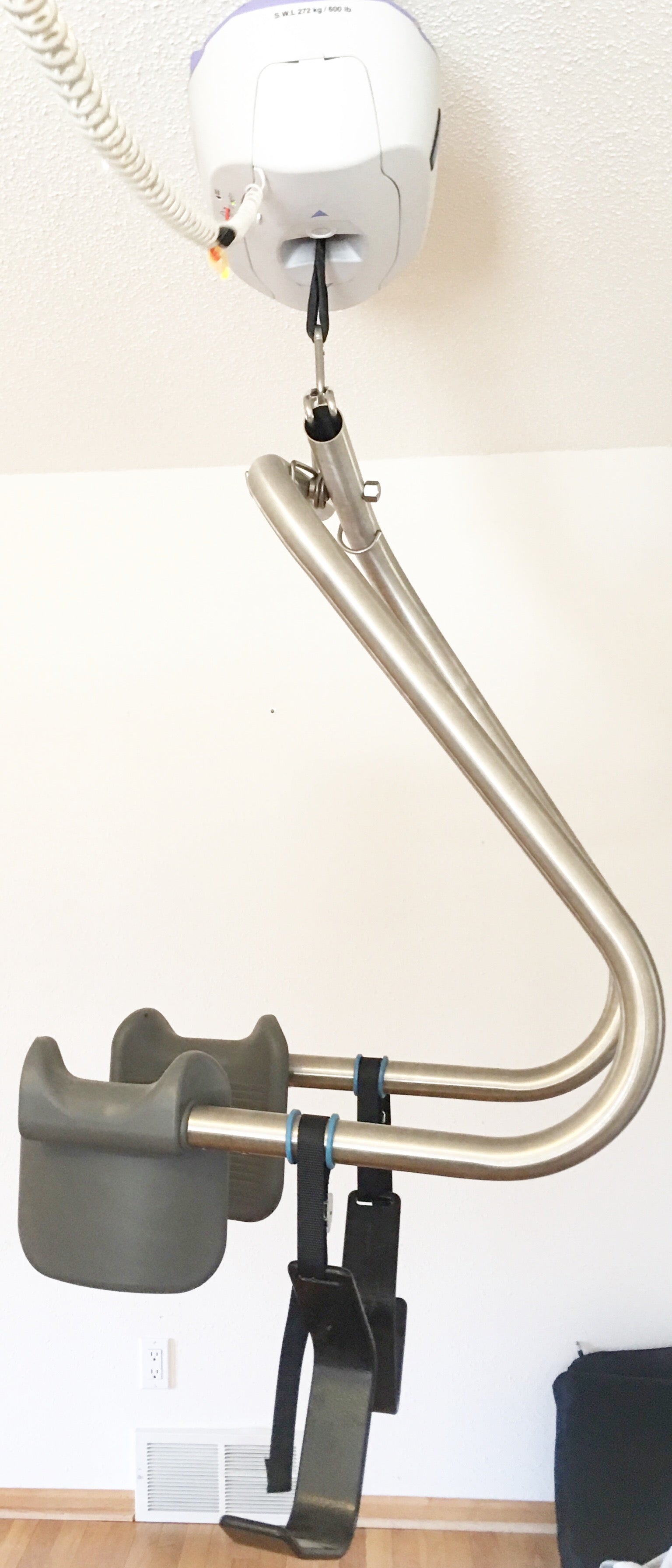• Para proporcionar transferencias independientes a las personas con alguna función del brazo que puedan obtener el soporte del muslo de la pierna debajo de su pierna de forma independiente, como una esclerosis paraplejada o múltiple o quad C7, asegúrese de usar con un elevador de transbordamiento de potencia (movimiento motorizado a la izquierda y directamente a lo largo de la pista usando el botón en el colgante). El motor no está incluido.
